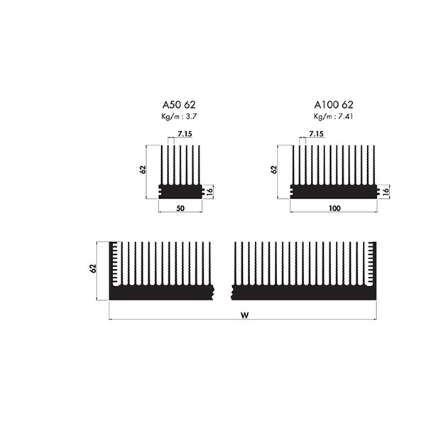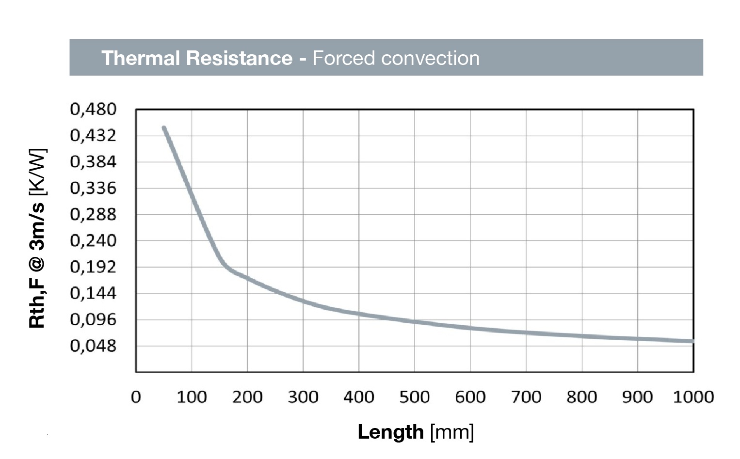Valori di resistenza termica calcolati per un dissipatore di calore largo circa 100 mm (W). Variando la larghezza del dissipatore, le curve di resistenza termica possono essere approssimate linearmente.