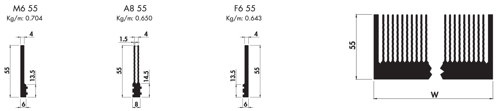 Thermal resistance values calculated for a 100mm ca. wide heat sink (W). Varying the heat sink width, the thermal resistance curves can be linearly approximated.
