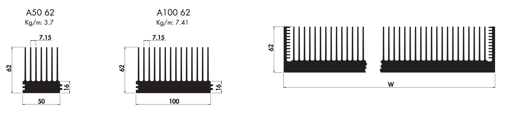 Thermal resistance values calculated for a 100mm ca. wide heat sink (W). Varying the heat sink width, the thermal resistance curves can be linearly approximated.