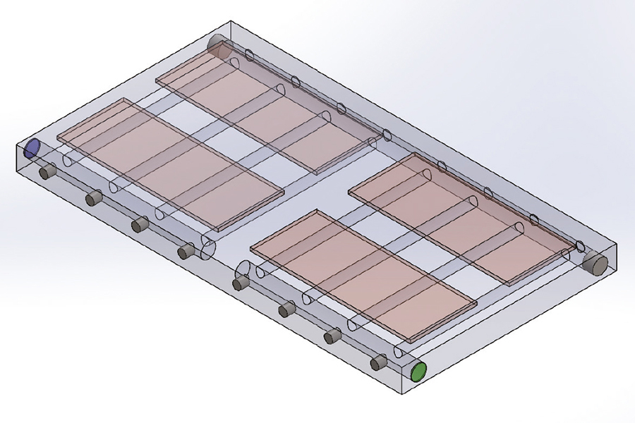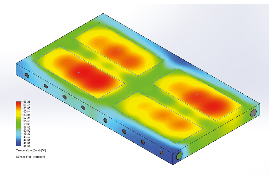 Nei piatti a liquido con fori passanti, i canali dei circuiti interni di raffreddamento sono ottenuti direttamente da estrusione o tramite foratura profonda di piastre piene. Il circuito dei canali viene ottenuto sigillando i canali stessi sia esternamente che internamente in punti specifici definiti dal progetto con l’utilizzo di tappi stagni posizionati per definire la circolazione del liquido desiderata.
